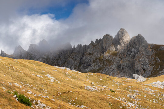 Landscape in the Durmitor mountains. Autumn colors, the hiking trail leading to Bobotov Kuk, rocks resembling the Dolomites in Italy. Montenegro, balkans.