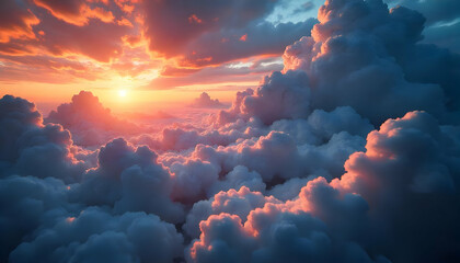 Aerial cloudscape view during golden hour with pastel shades and sun illumination