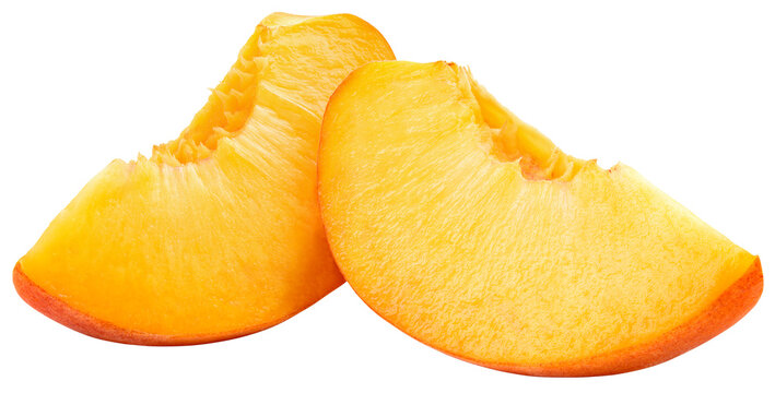 Peach slice isolated. Peach slices on white background. Peaches with clipping path.