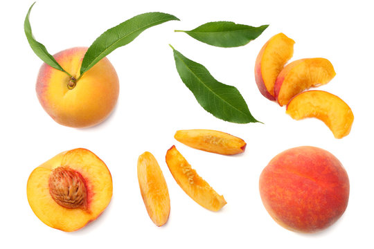 Close-up of vibrant peach slices and splashes on a white background with copy space, vivid, fresh