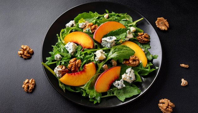 fresh salad with leafy greens ripe peach slices blue cheese crumbles and walnut pieces on a black plate