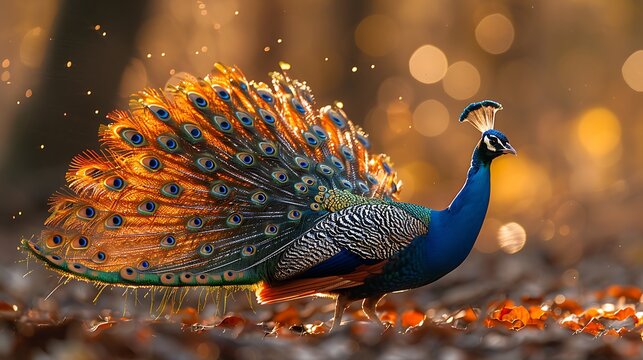 Majestic peacock with vibrant plumage and fiery feathers.