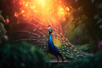Majestic peacock on forest path, sunrise, nature, tranquility, poster