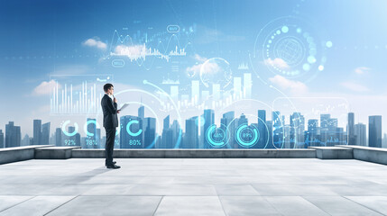 Businessman on building rooftop and forex graph chart with business dashboard. Ai generative