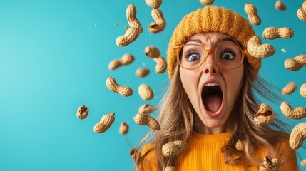 A surprised woman in an orange sweater shouts in excitement as peanuts fly around her, capturing a moment of pure surprise and whimsy in an engaging visual celebration.