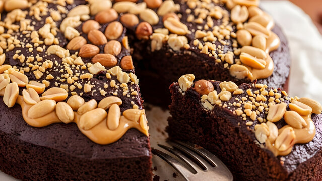 A rich chocolate cake topped with whole and crushed peanuts and creamy peanut butter, with a slice cut out and ready to eat.