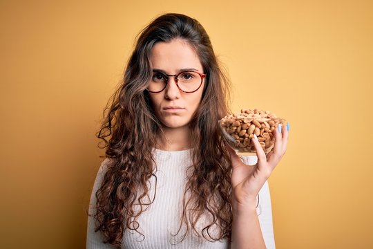 Young beautiful brunette woman holding bowl with peanuts over isolated yellow background with a confident expression on smart face thinking serious