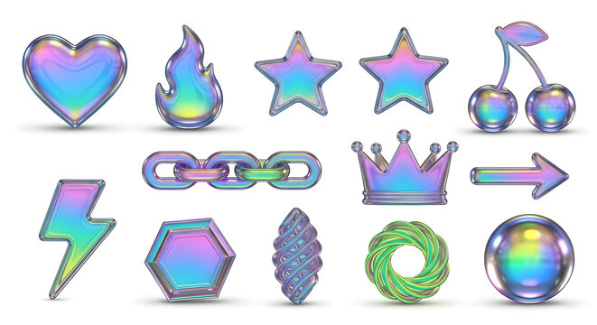 A collection of 3D rendered icons with a vibrant, metallic holographic and iridescent finish on a white background.