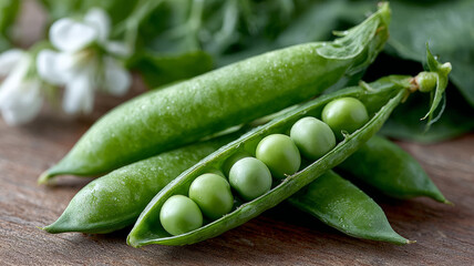 Three happy peas in a pod on a bright teal background, cute and cheerful