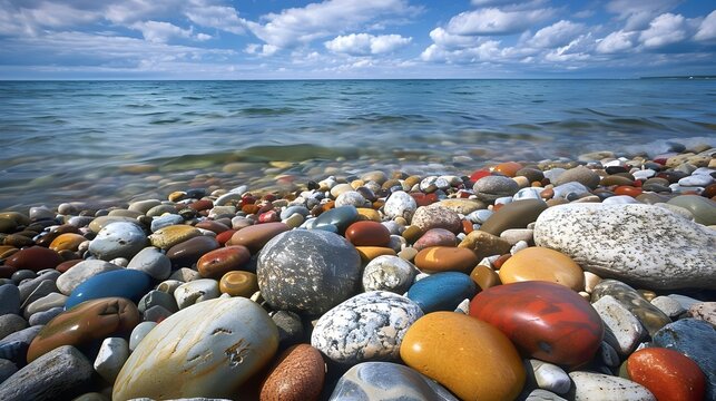 A pebbled shore with stones of various sizes, from tiny, smooth pebbles to large, jagged rocks, creating a varied texture