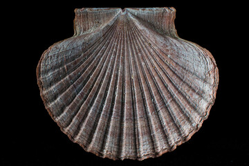 Mexican flat scallops, gisella shells,mollusk shell pecten vogdesi sea shell in black background in macro photography