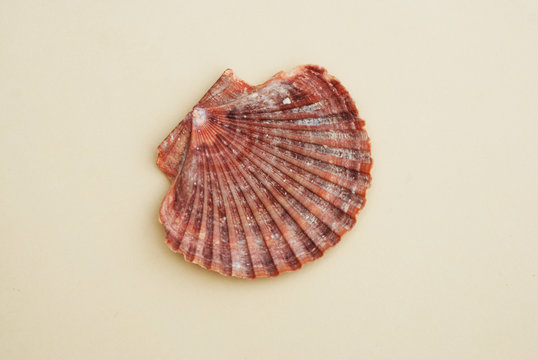 Scallop Shell Isolated on Neutral Ivory background. Close-up view. Summer and Holliday Concept.