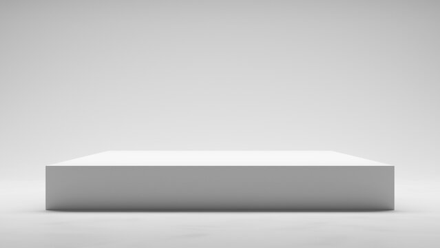 White empty table isolated on white clear soft light studio room. table top podium close up. Empty square cube form podium display for design, grey pedestal empty space background