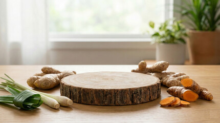 Empty rustic wooden table podium with background of autumn forest for product display and placement