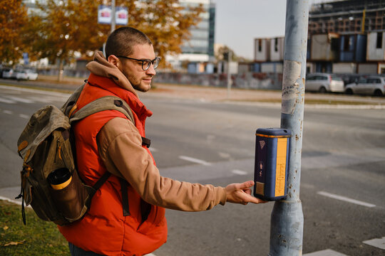 Man with backpack presses pedestrian crossing button on city street in Belgrade. Modern buildings and cars in background