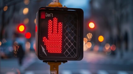 A pedestrian crossing signal indicating "Don't Walk," with a red hand symbol warning pedestrians to wait for the next signal change.