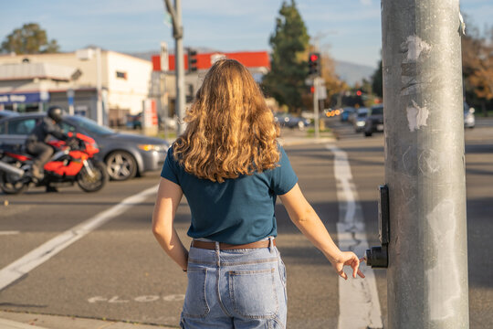 Diverse schoolgirls crossing road for safe journey to school on sunny day