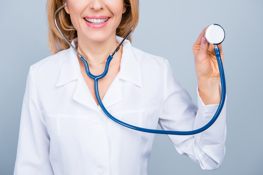 Cropped close up photo of cheerful smiling happy confident female doctor using the stethoscope,  for listening to the patient's breath, isolated on grey background