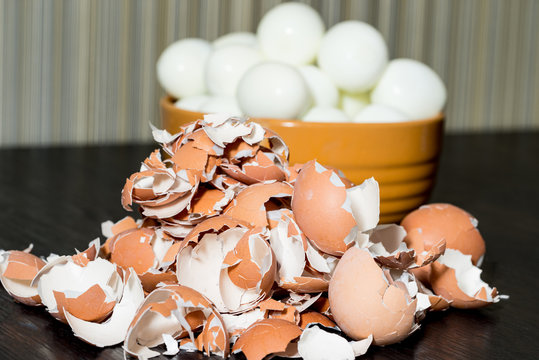 Bunch of boiled and peeled eggs end eggshell in a bowl. Concept of food and organic farm products.