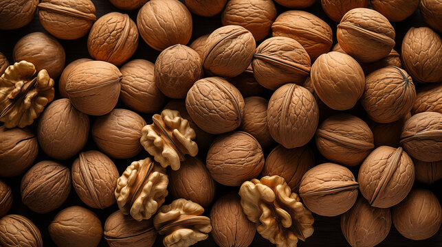whole and peeled walnuts. Healthy food concept. Heap of walnuts. Walnuts Background Texture. Background of fresh walnuts.