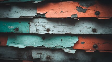 Macro shot of a weathered wooden surface with layers of chipped paint in various colors