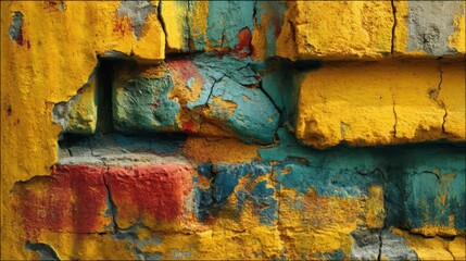 Close up of a weathered wall revealing layers of cracked and peeling paint, creating a textured and aged surface