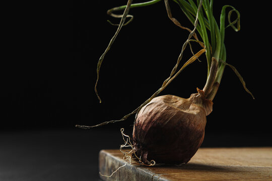 Young housewife beginner cook crying while cutting onion.Slice,dice and chop onion.Stinging eyes and tears when cutting onions to prepare dinner.Shedding tears and wiping with the back of her hand.