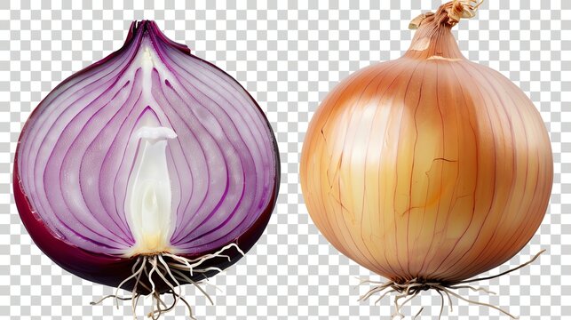 On the left, a red onion cut in half, on the right, a whole yellow onion. Both have brown roots.
