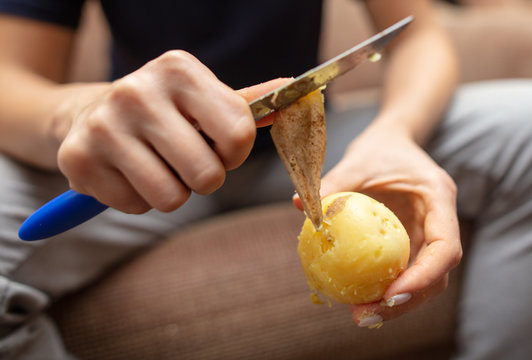 Isolated of peeled potatoes placed together on a spotless white surface ready for cooking Stock Photo with side copy space