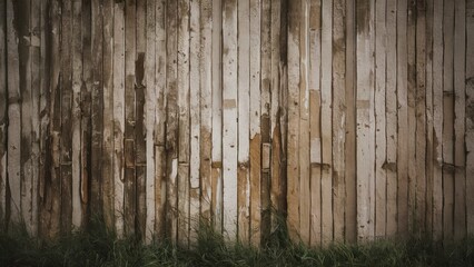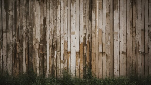weathered wooden wall with peeling paint in earthy tones of brown and beige with green grass at the bottom creating a rustic background scene