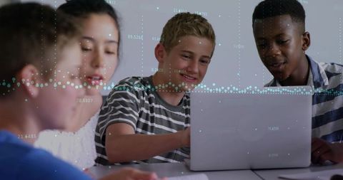 Elementary students collaborating around laptop in school library, teamwork and curiosity