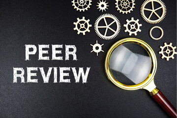 Businessman looking through a magnifying glass on a peer to peer structure.