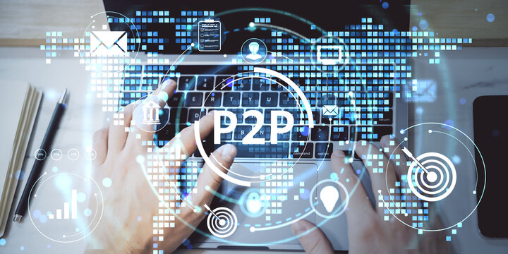 Hands typing on laptop keyboard with digital peer-to-peer (P2P) finance and technology icons overlayed on futuristic business data background.