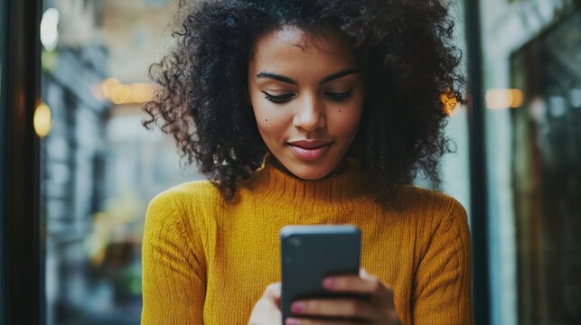Unexpected Encounter: A captivated woman, radiating surprise and delight, peers intently at her smartphone, a captivating urban background.