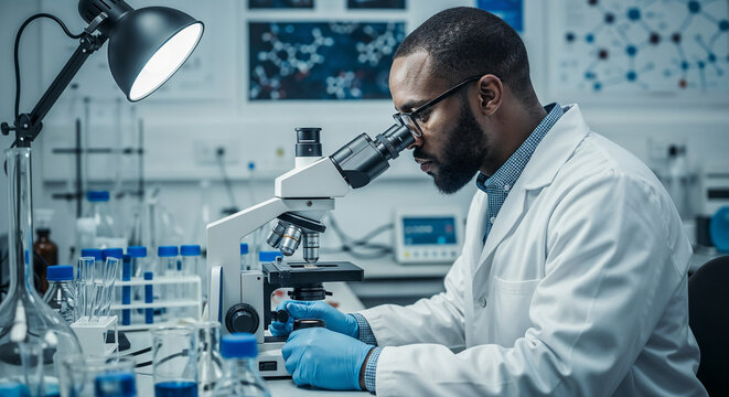 Scientific Precision in the Lab: A focused scientist peering intently into a microscope within a modern laboratory, his face illuminated with concentration.