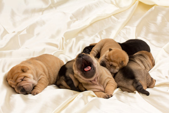 Adorable wrinkled shar pei puppy relaxing on red couch