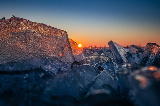 Fonyod, Hungary - Transparent ice cubes on the frozen Lake Balaton on a cold winter afternoon with golden sunset lights and clear blue sky and sun