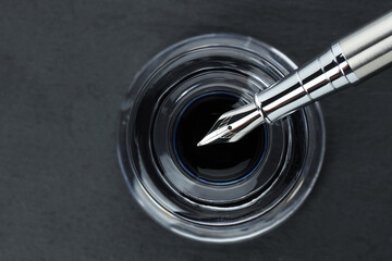 A glass inkwell filled with vibrant blue ink sits beside a fountain pen on a light blue background