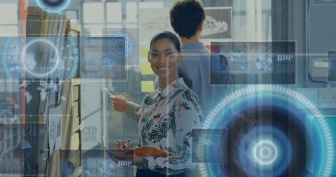 Mature woman holding smartphone showing qr certificate with teal nft hexagon overlay