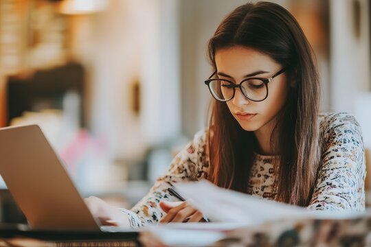 Teenage girl studying concentrating at home with pen in mouth