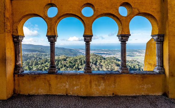 Sintra, Portugal - July 8 2025: The beautiful decorated windows of Pena Palace in Sintra, Portugal