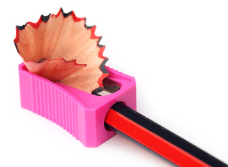 A black pencil , pencil sharpener and pencil scraps on the white background.