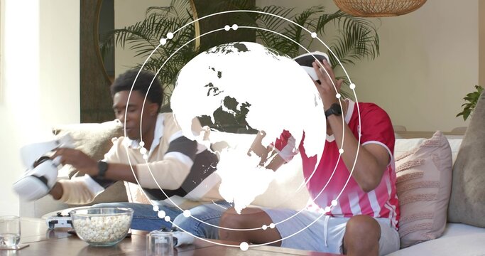 Testing VR headsets, two men wearing sweater and jersey on living room sofa, popcorn on table