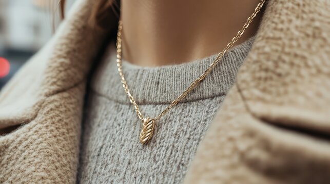 Close-up of a woman wearing a delicate gold necklace with a small heart-shaped pendant and a cozy knitted sweater, looking thoughtfully to the side.