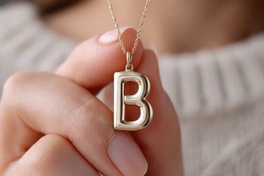 Shiny golden letter B pendant held delicately between fingers against a soft sweater backdrop