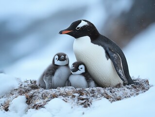 Gentoo penguin with two chicks in a snowy landscape, showcasing family bonding and wildlife in the Antarctic environment.