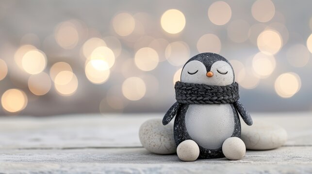 A serene penguin ceramic figurine sits with eyes closed, wrapped in a chunky scarf, set against a warmly glowing backdrop that enhances its tranquility and charm.