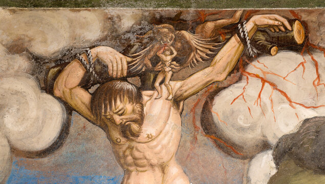 BIELLA, ITALY - JULY 15, 2022: The detail of Impenitent thief as the part of Crucifixion fresco in the church Chiesa di San Sebastiano by master of Lombard school from 16. cent.