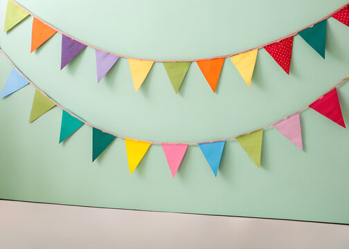 Colorful paper bunting flags on string against light green background. Festive triangle garland with vivid colors. Perfect decor for celebration, party, home interior. Cheerful minimalist simple