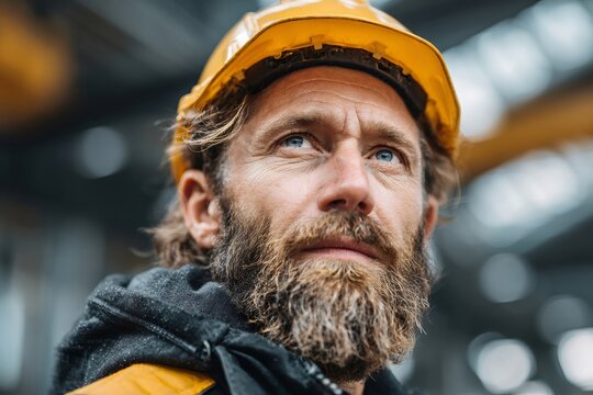 Factory worker monitoring systems, thoughtful expression, industrial background, safety gear